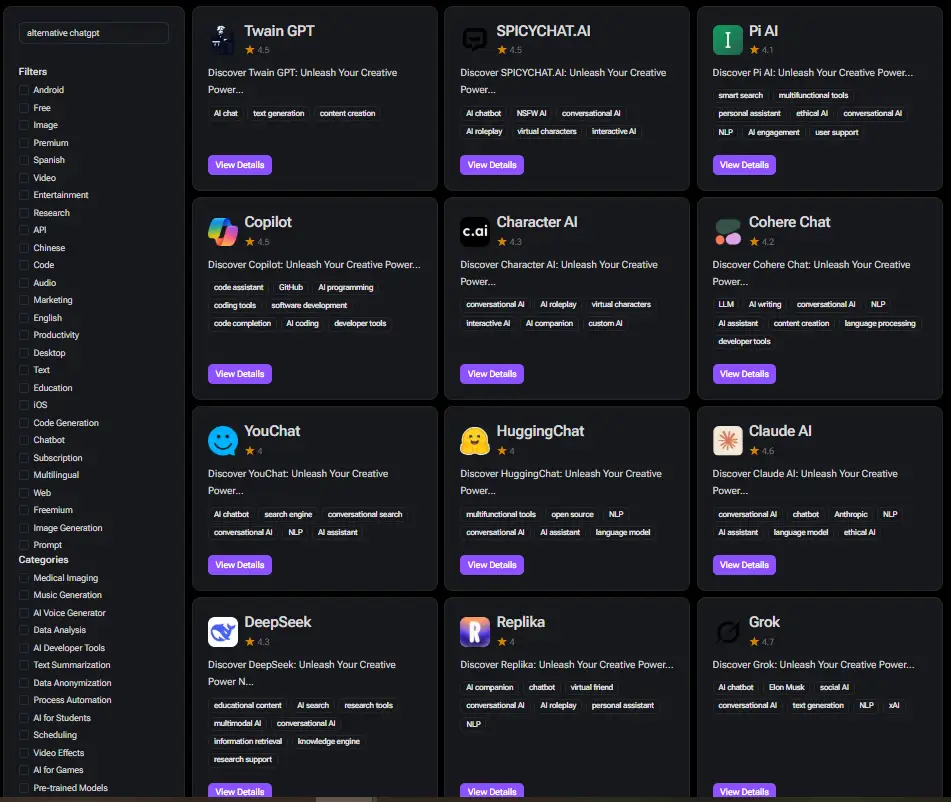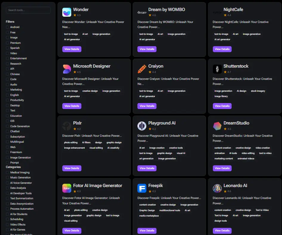Discover AI Finder, an advanced AI-powered search engine designed to help you find the perfect artificial intelligence tools in just seconds. From cutting-edge image generators and powerful writing assistants to marketing automation platforms and productivity boosters, everything is organized in one smart, user-friendly hub. With intelligent filtering, real-time suggestions, and a clean interface, AI Finder makes exploring the world of AI faster, easier, and more enjoyable than ever. It’s your shortcut to the latest and greatest AI innovations.
